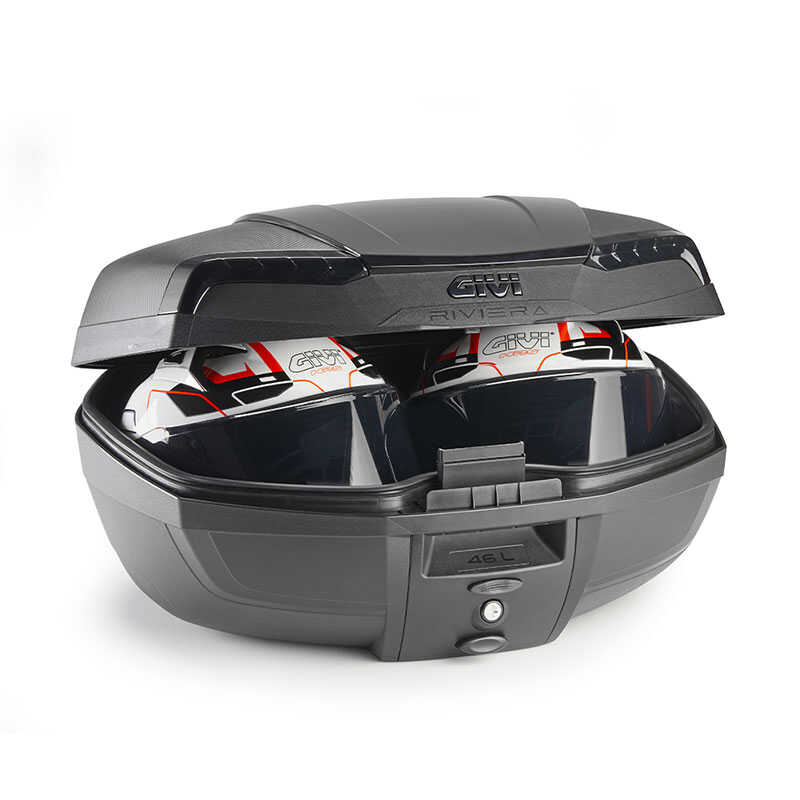 GIVI E46NB RIVIERA ÇANTA (MONOLOCK) [kumas] MALZEME • Çizilmeye dayanıklı yüzey • Aerodinamiğe fayda sağlayan yuvarlak hatlar • Uzun ömürlü estetik kalite sağlamak için özel iç boya ile kaplanmıştır [havalandirma] ÖZELLİK • 46 Litre kapasite • Fırtına ve doluda hem laboratuvarda hem de yolda çok sayıda testle kanıtlanmış çok yüksek bir su geçirmezlik seviyesi • Otomatik açıp kapama sistemi • Gerektiğinde tek bir hareketle çantayı çıkarıp götürebilme özelliği(anahtarla) • Reflektörlü • Tabla kutu içerisinden çıkmaktadır. • Çift kask alabilir • Genişlik : 57,8cm • Yükseklik : 30,5cm • Derinlik : 44,8cm