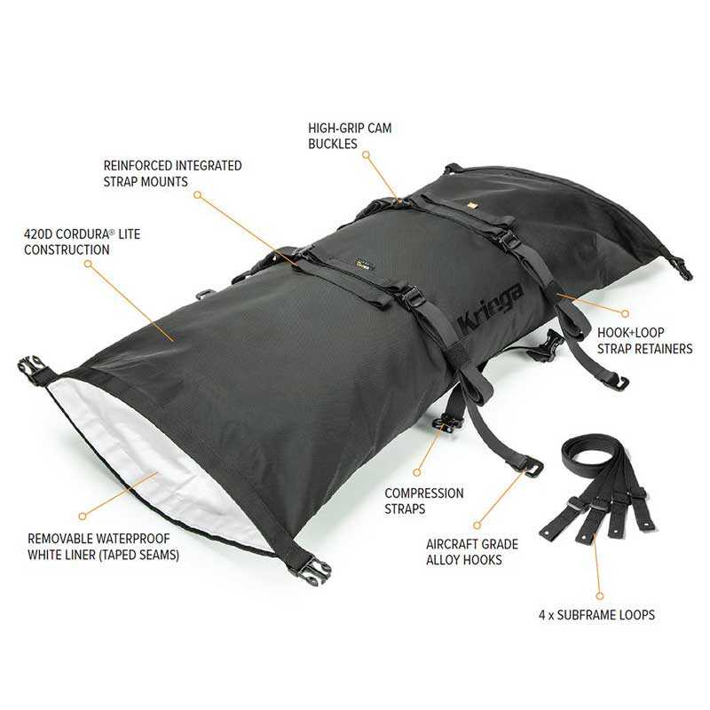 - Hızlı ve kolay takmak için entegre kam tokası kayışları motosiklet çerçevesinin etrafında döner ve çantaya 'geri kancalanır'.