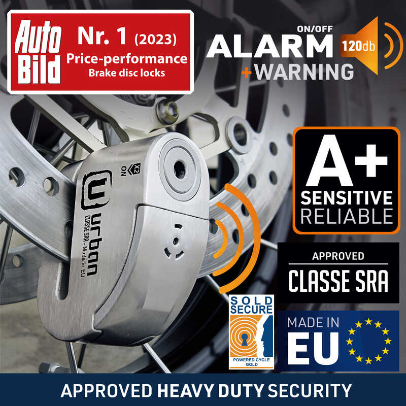 CLASSE SRA onaylı URBAN UR14S motosiklet disk kilidi, güvenliği yeniden tanımlıyor. Yüksek kaliteli paslanmaz çelikten üretilen bu kilit, ø14 mm kilitleme mili ve yenilikçi çift kilitleme sistemi ile donatılmıştır. Bu sistem, mili hem kilidin içinde hem de sağlam tabanında sabitleyerek direnci ve güvenilirliği iki katına çıkarır.Alarm İle veya Alarm Olmadan Kullanım